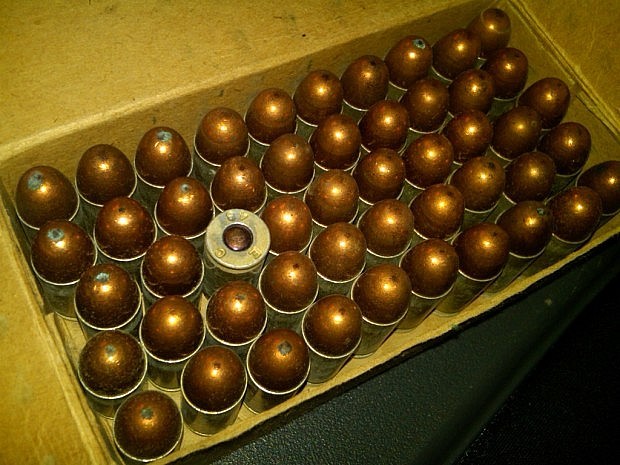 This box of .45 cal. pistol rounds is from World War II and is very much live.