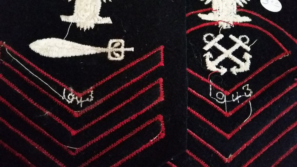 These Torpedoman 1/c and Chief Boatswain’s mate rating badges have the dates placed in the apex of the top chevron.