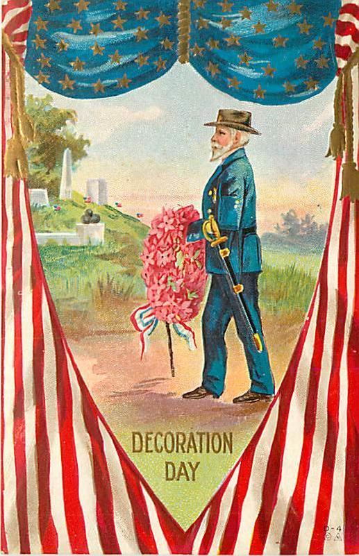 A few years ago, I started taking notice of various references to Decoration Day and antique items that make mention of it. One of those items that caught my attention was a postcard (from the early 20th Century) depicting an elderly Civil War veteran placing a wreath of flowers at a grave. The image, an illustration, was so moving that I was overwhelmed with emotions. The postcard evoked more recent memories of World War II veterans (at D-Day celebrations) paying respects to their fallen comrades some 70 years hence and the fresh, vivid memories painted across their faces.