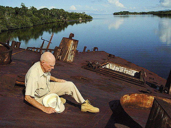 World War II Veteran Mac MacKay pauses for reflection after placing a wreath aboard his former ship, the LST 342, during a trip that several veterans made to Guadalcanal and Tulagi in 2009 (Photo courtesy of Anderson Giles).