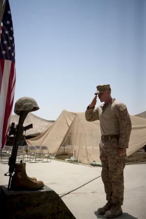 A U.S. Marine with 2nd Battalion, 8th Marines, Regimental Combat Team 8, pays his final respects to U.S. Marine Corps Cpl. Kyle R. Schneider during a memorial ceremony held at Patrol Base Hanjar, Sangin, Afghanistan July 7. Schneider was killed in action while conducting combat operations in the district on June 30, 2011(U.S. Marine Corps photo by Corporal Logan W. Pierce).