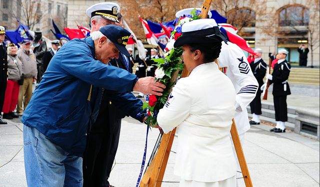 WWII Navy Veteran Frank Yanick honors fallen comrades by placing a wreath at a WWII memorial in 2012 (source: U.S. Navy photo )
