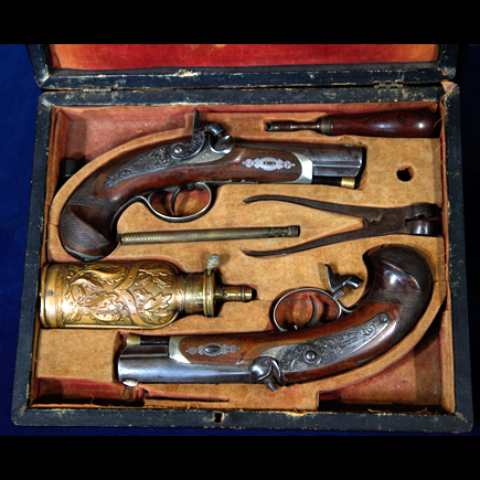 While watching an episode of the popular PBS television program History Detectives, a woman desired to learn more about a boxed set of named (inscribed) mid-19th century Derringer pistols (season 10, “Civil War Derringers, KKK Records & Motown’s Bottom Line”) that her father purchased in the 1970s. The woman had previously had the Derringer set appraised on another PBS show, Antiques Roadshow (Pittsburgh #1607) for $30,000 but she had no idea who the original owner was or any details surrounding the history of the pistols. Included with the pistol was a document detailing the post Civil War pardon of a Confederate soldier – the name matched the one inscribed on the pistols.