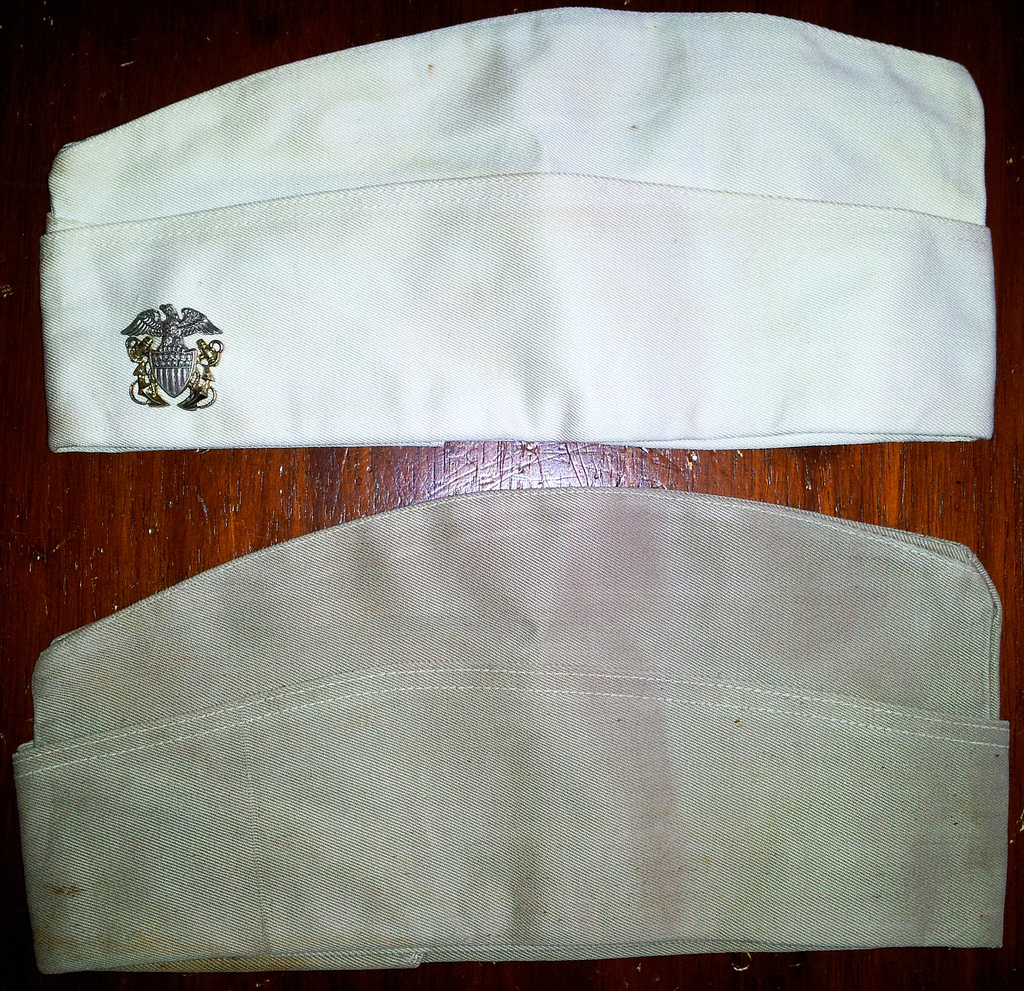 Pictured here with an early WWII chief radioman’s eight-button, dress white uniform jacket, the (yellowing and aged) white garrison cover is a bit more distinguishable from a khaki variant.