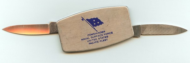 This flat Zippo pocket knife was left behind aboard my ship following one of the many parades of high-ranking naval officers who wanted to see what the (then) newest naval technological marvel could do.