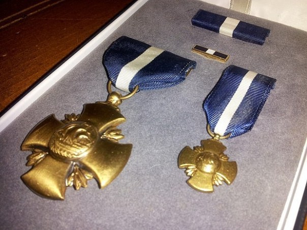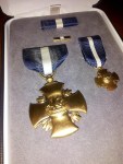 As it was a school day and my kids are home-schooled, my son was nearby immersed in his math studies. I called him over to read the posting and to look at the pictures of the free item that was offered by this thoughtful collector. My son, who is fourteen, has a keen interest in history, including military history (hard to tell where he gets that from) and took to militaria a little more than a year ago. He read the details of the forum post and I watched as his eyes grew wide, viewing a full set of medals, full and miniature, ribbon and lapel pin of a fairly current Navy Cross in a presentation case, in unissued, new condition. He promptly responded to the offer, indicating that he wanted the medal for his collection.