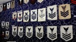 - Showing the 8-button Machinist’s Mate Chief (bullion) and Electrician (radio) 2/c from WWI uniforms backed by ratings, distinguishing marks and shoulder insignia patches and WWII warrant officer shoulder boards and devices.