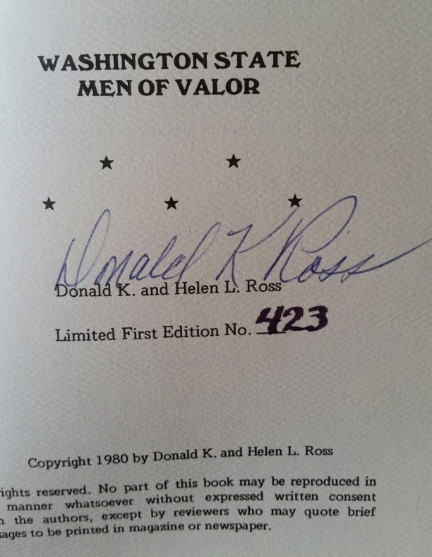 Captain Donald K. Ross, Medal of Honor recipient (for his actions aboard USS Nevada on December 7, 1941) wrote this book about MoH recipients with ties to Ross’ adopted home state.