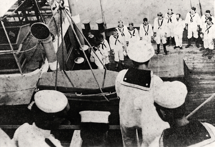 Casket of John Paul Jones is lowered to the deck of the USS Standish (U.S. Naval Historical Center Photograph.).
