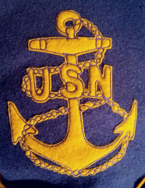 This CPO emblem affixed to the bottom corner of the pillows face is modeled after the then current design of the hat device worn by chief petty officers. The most glaring difference between a WWI and WWII device is the lettering and the orientation of the chain.