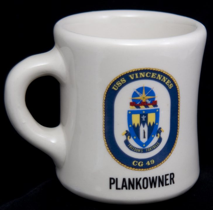 Not too long after the ship commissioned, crew members ordered these personalized mugs with “plankowner” beneath the ship’s crest.