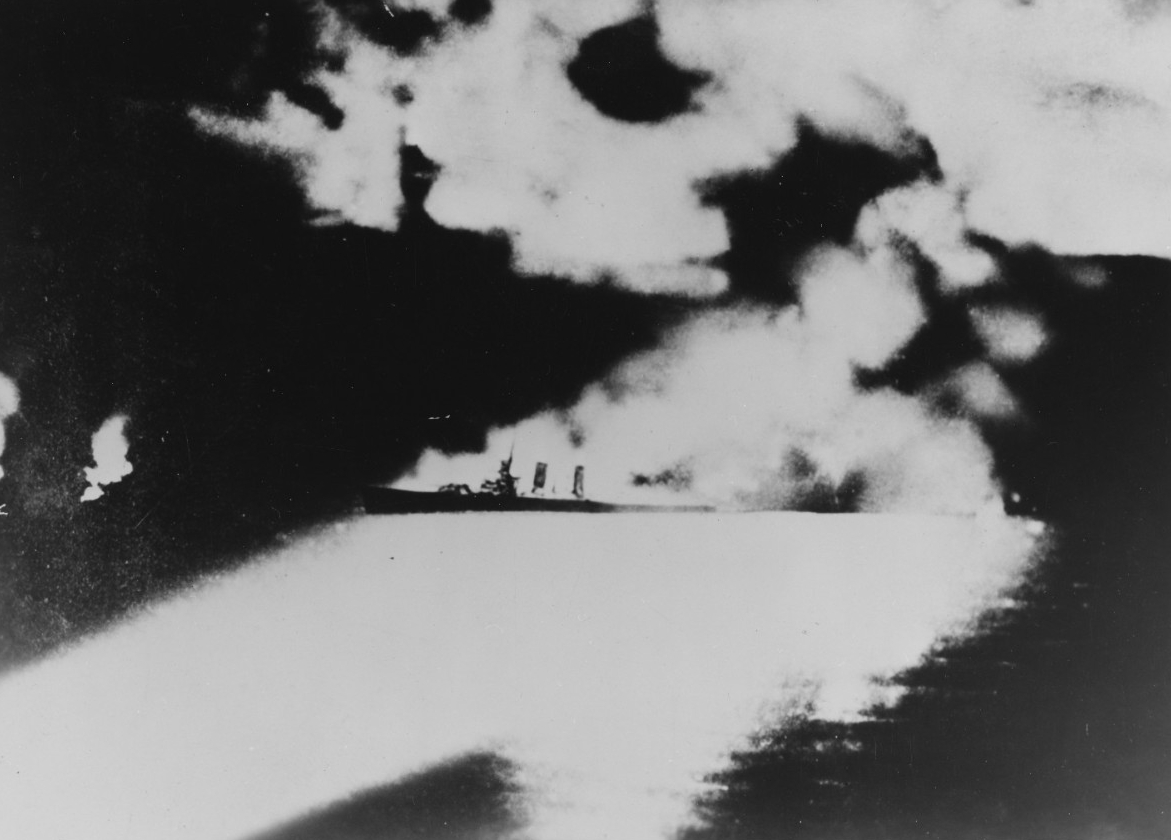 USS Quincy (CA-39) photographed from a Japanese cruiser during the Battle of Savo Island, off Guadalcanal, 9 August 1942. Quincy, seen here burning and illuminated by Japanese searchlights, was sunk in this action (image source: Naval History and Heritage Command | NH 50346).