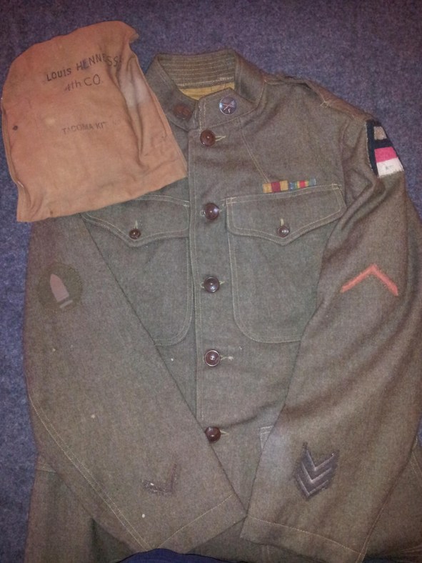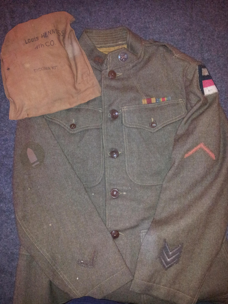 My uncle’s WWI army uniform blouse. On the right sleeve. the shoulder insignia (the “A”) denotes First Army. The red chevron signifies an honorable discharge and the three inverted chevrons indicate 1.5 years of overseas service (each represents 6 months). On the left sleeve, the artillery shell and underline represent that he was a Gunner First Class and the single inverted chevron is a wound stripe (the precursor to the Purple Heart which was established in 1932)