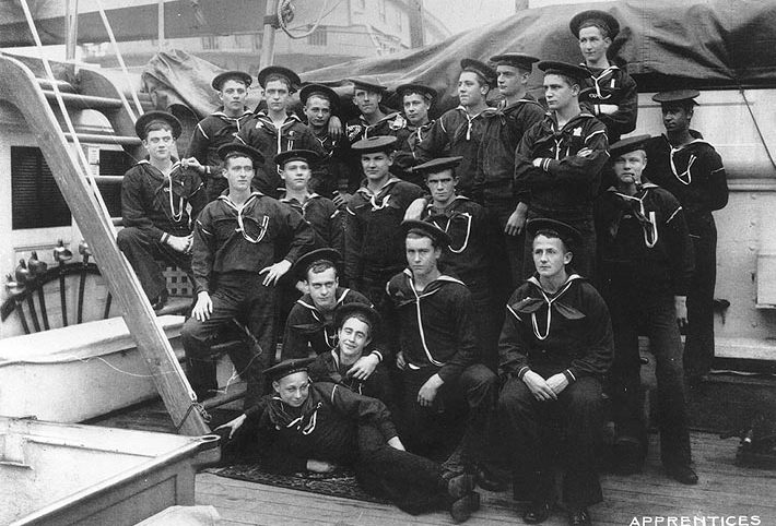 These USS Enterprise (a barque-rigged screw sloop) apprentices are posing for this 1890 photo on deck. Take note of the very broad diameter of some of the flat hats worn by these sailors (Naval History and Heritage Command).
