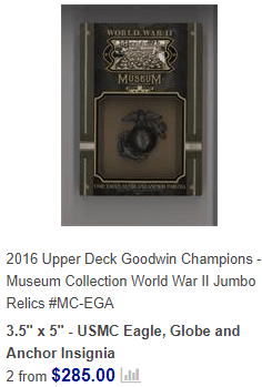 Upper Deck certainly is not the first to venture into the destruction of artifacts however they seem to be the organization that has kicked the door wide open for highly inflated prices for somewhat ordinary militaria on the secondary market. Military collectors, especially those who specialize in specific areas will shake their heads when they see the prices listed by dealers of Upper Deck’s militaria pieces. When one can purchase a matched pair of genuine World War II period correct Eagle, Globe and Anchor (EGA) collar devices for less than $20, imagine their surprise to see an asking price of near $300 for a single EGA that is enclosed in an Upper Deck package.