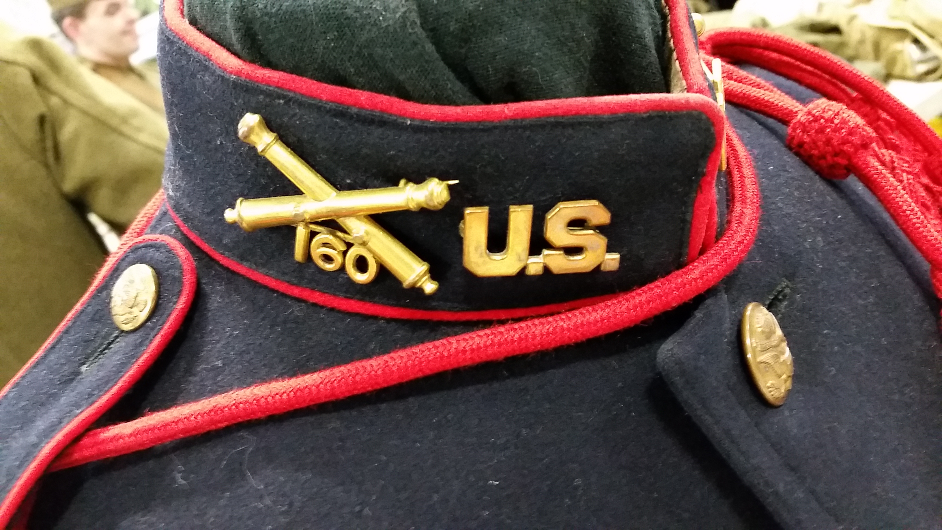 The large brass crossed cannons devices are spectacular against the blue wool and artilleryman red trim.