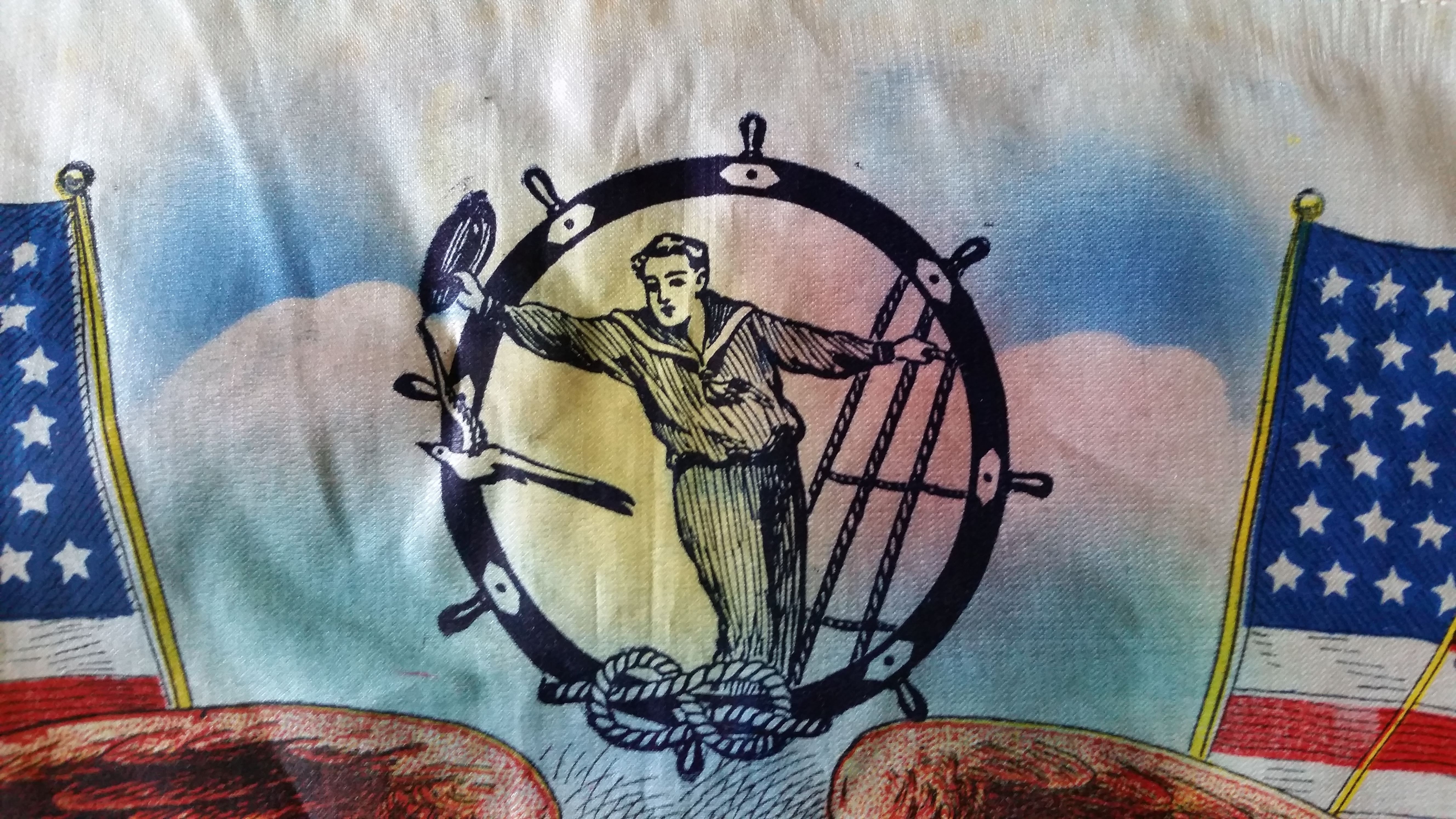 The silk screen printing is crisp as is visible in the small image of a sailor posed in rigging.