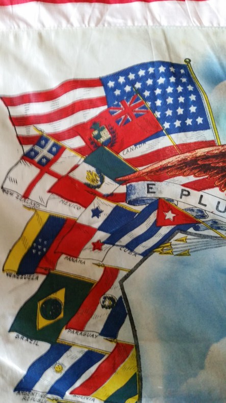 The upper left panel of the USS Tacoma (C-18) silk pillow cover. Pay particular attention to the flags of Canada and New Zealand (Flag of the United Tribes of New Zealand)