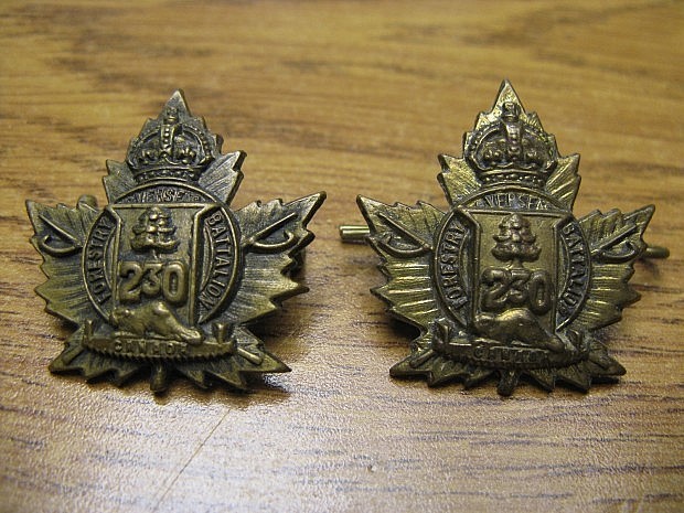 I located this pair of C.E.F. Forestry Corps collar devices after a rather lengthy search. Their maple leaf and beaver-clad design belie the wearer’s role in the Expeditionary Force (source: eBay image).