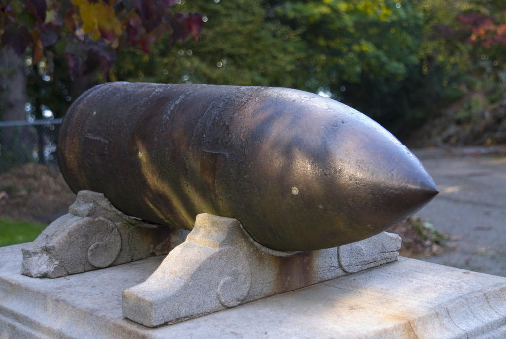 The well-weathered granite base and projectile (from the Maine) is tucked away inside Point Defiance Park in Tacoma, Washington.