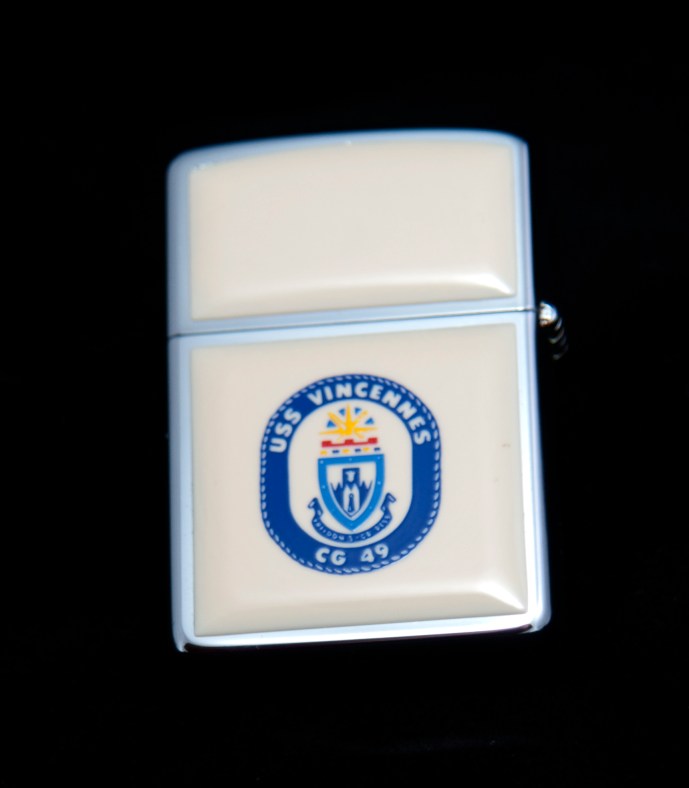 This is another USS Vincennes Zippo from the 1980s clad in ivory plastic and engraved with the ship’s crest.