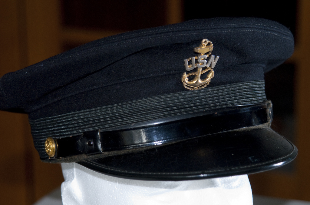 Assembled from serviceable components from a few WWII navy hats, my dress blue chief radioman display is closer to being complete with this cover.