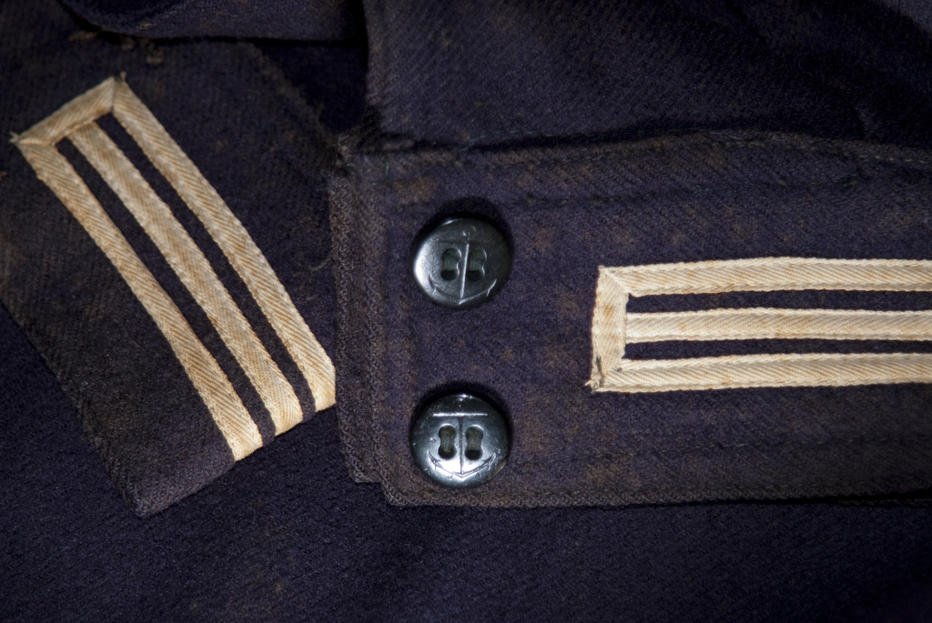 Three stripes on the cuff denote that this sailor advanced to seaman (and then onto petty officer second class).