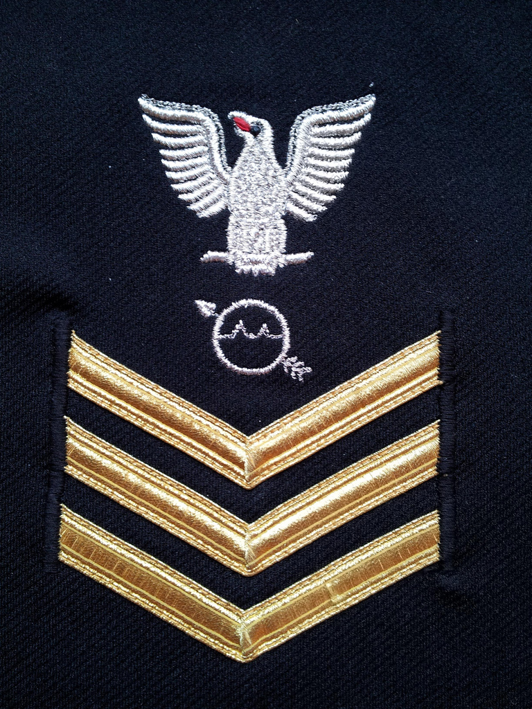 This current-issue OS1 rating badge is what one would expect to see – a first class petty officer with gold chevrons (indicating at least 12 years of good conduct service) – rather than a second class with bullion and red chevrons.
