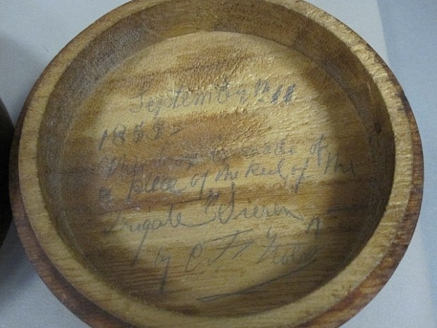 Wooden box carved from the keel of the brig Siren (Syren), by C.H. Holst in 1855. The Syren was one of the first brigs built for the U.S Navy in 1803 at Philadelphia by Nathaniel Hutton. The Syren participated in the Barbary War, and the War of 1812. The ship changed her name to Siren in 1810 (source: Collection of Curator Branch, Naval History and Heritage Command).