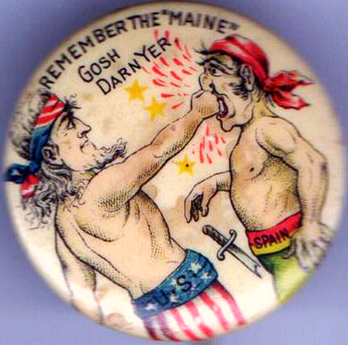 America fights back. This button demonstrates the angry sentiments of the day with, “Remember the Maine – Gosh Darn Yer” (source: eBay image).