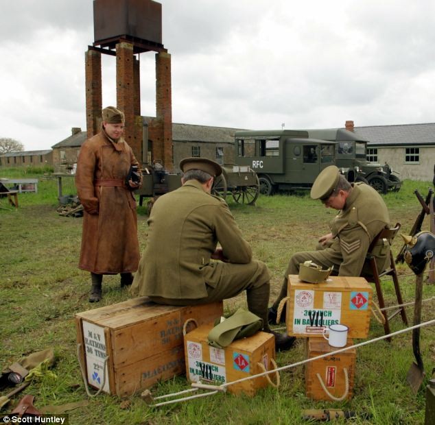 WWI reenactors exchange war stories at the Stow Maries Aerodrome (source: Daily Mail).
