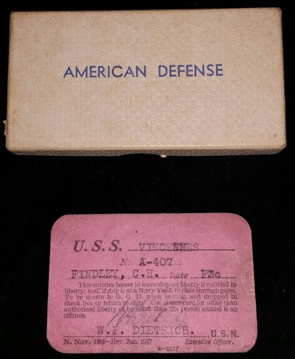 The boxed American Defense Service Medal and liberty card group from USS Vincennes (CA-44) survivor, Fireman 3/c Charles Henry Findlay.