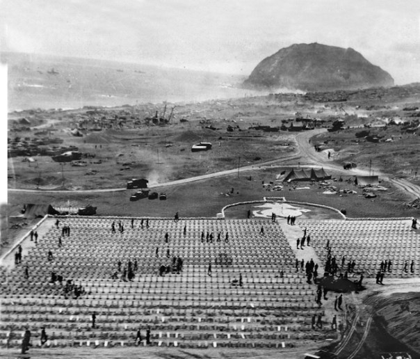 Iwo Jima 1945 – the 3rd and 4th Marine Division Cemetery was beautifully laid into the volcanic soil. Though David Gaultney was laid to rest here, he (along with all of the Marines buried here) would ultimately be removed from the island and relocated (U.S. Navy photo).