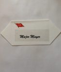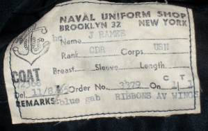 Commander John Ramee’s jacket label from the Naval Uniform Shop of Brooklyn, NY, Note the remarks (blue gaberdine, ribbons and aviator wings) mentioned at the bottom.