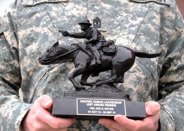 Bearing a personalized plate for 1SG Jon D. Noyes, this U.S. Cavalryman statue, sculpted by A. Phimister Proctor, is now being used as part of the Draper Armor Leadership Unit Award rather than as the Goodrich Riding Trophy. This re-cast of the original trophy lacks the detail of the one cast in 1926 and the re-cast sculptures of the 1970s and appears to no longer bear the artist’s signature in the casting (image source: DVIDS/U.S. Army).