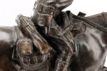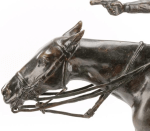 Reproduction of Alexander Phimister Proctor’s (American, 1860-1950) “Goodrich Riding Trophy”-1926, bronze. A 1977 casting after Alexander Phimister Proctor’s (American, 1860-1950) original 1926 casting depicting a cavalryman on horseback with pistol aimed to fire, on marble plinth base, with inscription “Goodrich Riding Trophy”, signed to back “A. Phimister Proctor”. This casting was produced by the Draper Combat Leadership Trust in an edition of 46. Overall (with base) approximately 20.75″ x 26″ x 8″; (without base) 17.5″ x 20.75″ x 7.75″ This example was auctioned for $600 (image source: Ahlers and Ogletree Auctions).