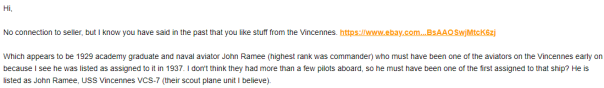I make no secrets about the sort of pieces that I pursue with my collecting interests and I am reminded constantly by friends, family and colleagues that I have been effective in communicating my activities. When I received a private message from a collector colleague regarding an auction listing that detailed a uniform item from a naval aviator who had served aboard the heavy cruiser, USS Vincennes (CA-44) before World War II, I was compelled to check into the auction. When I attempted to access the link to the auction listing that accompanied the message, the listing had closed, though without a bid being submitted.