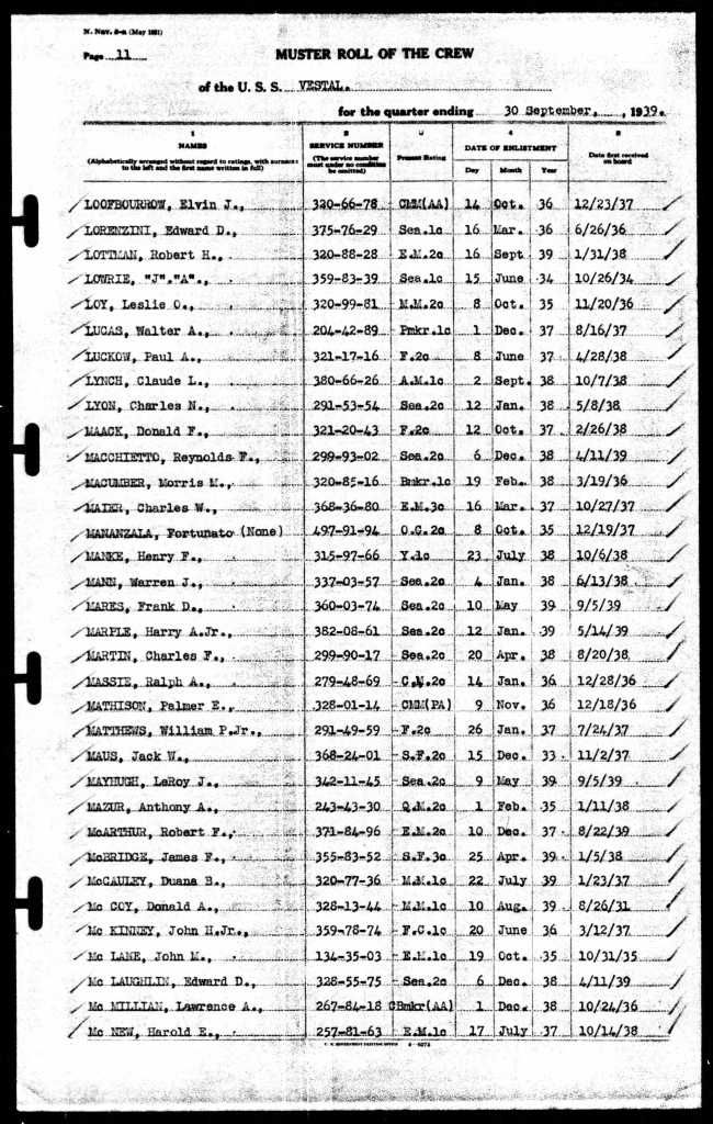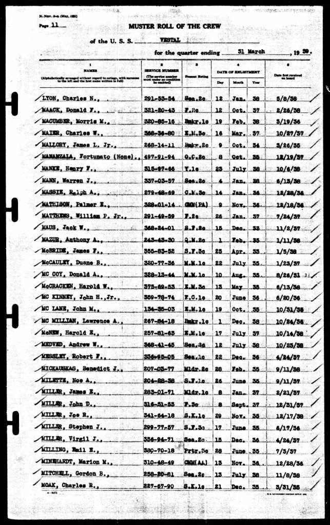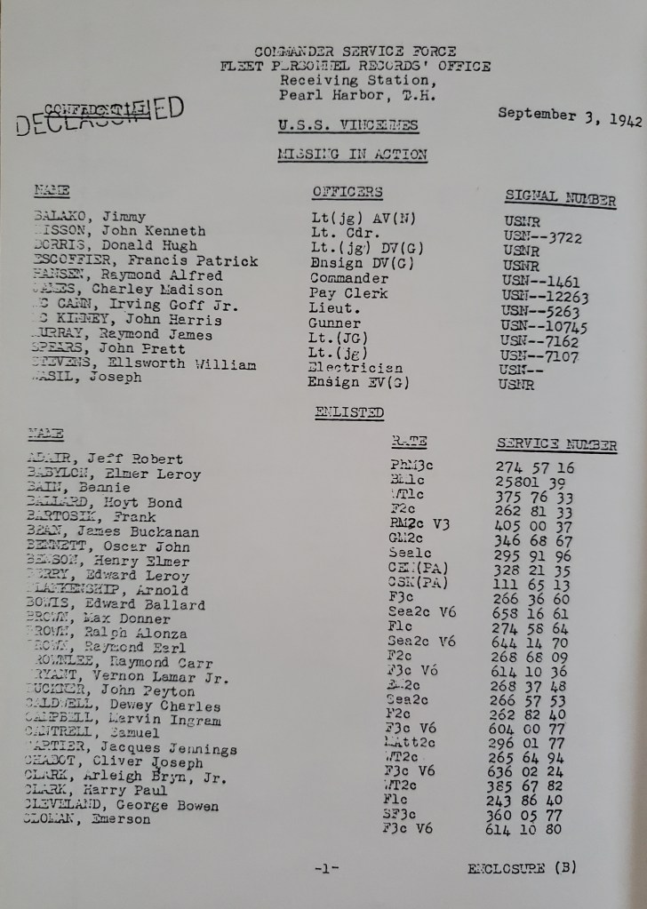 A grim reminder of naval warfare, this list of those USS Vincennes sailors who remained missing months after the ship was lost in the Battle of Savo Island, August 8-9, 1942. MM1/c Leonard Gaultney is listed among the MIA.