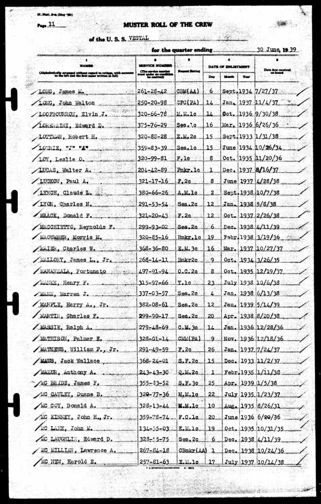 John Harris McKinney, Jr. was born on April 10, 1912 in Dalhart, Texas to John and Audie Bell. McKinney graduated from Mercedes High School in 1930 and enrolled into an Reserve Officer Training Corps program in San Antonio. John enlisted into the U.S. Navy late in 1932 and completed recruit training and Naval Training Station San Diego, California. Apprentice Seaman McKinney was assigned to the Northampton-class heavy cruiser USS Augusta (CA-31) on May 21, 1933. On January 26, 1936, McKinney was detached from the Augusta and reported aboard the repair ship, USS Vestal (AR-4) on March 12, 1937. The gap between ship assignments may have been spent on a shore command and during this time, he married the former Rubye Lee Hedrick in San Pedro, California on July 8, 1936. After completing his first term, McKinney, now rated as a fire controlman third class, reenlisted on June 20, 1936. McKinney’s career path and advancement was accelerated despite the peacetime Navy’s limited manning. John and Rubye welcomed their son, John Harris McKinney, III on December 5, 1937. Detached from Vestal on November 14, 1939, Fire Controlman first class McKinney was sent to advanced fire control school in Washington D.C., Long Island City and at Schenectady, New York. Following his completion of schools, McKinney was commissioned as a warrant officer (W-1), Gunner. With ten years of service, Gunner McKinney was halfway to retirement and a pension.