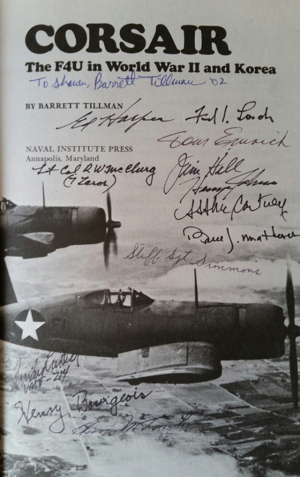 Meeting 12 of the surviving members of the Blacksheep of VMF-214 was a thrill for me. Ace, Lt. Colonel (Pappy Boyington’s wingman) was quite amusing as he and his wife “attempted” to steal my baby daughter, snickering and laughing as he wheeled her stroller away. All that I had to get signed was this book by notable author, Barrett Tillman.