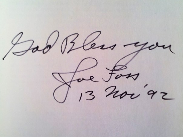 Another Marine Corps ace and Medal of Honor recipient, Major Joe Foss’ signature in his autobiography is a treasured addition to my collection.