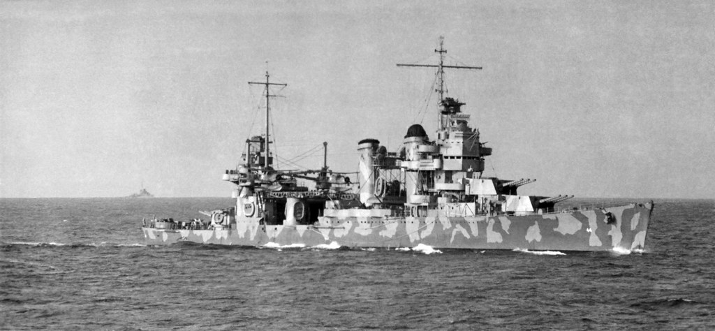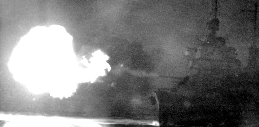 USS Quincy (CA-39) photographed from a Japanese cruiser during the Battle of Savo Island, off Guadalcanal, 9 August 1942. Quincy, seen here burning and illuminated by Japanese searchlights, was sunk in this action. To the left of the image, USS Vincennes (CA-44) can be seen burning in the distance (image source: Naval History and Heritage Command | NH 50346).