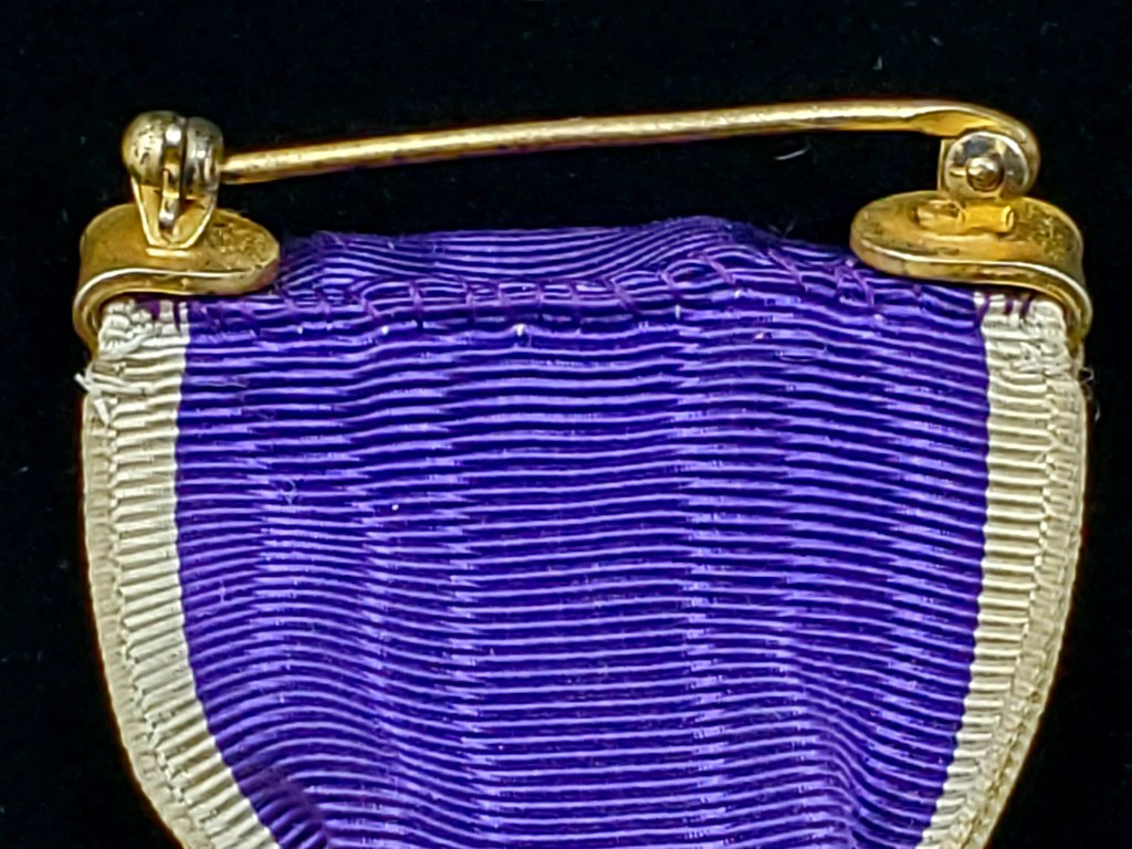 Seeking further consultation led to a colleague offering us the correct, type-1 brooch, ribbon and suspension ring to effectively restore McKinney’s medal. The replacement brooch, ribbon and suspension ring were had been removed from another type-1 Navy Purple Heart Medal and were in fantastic condition. By simply removing the existing suspension ring and replacing it with the new piece, the Gunner McKinney medal was made whole.