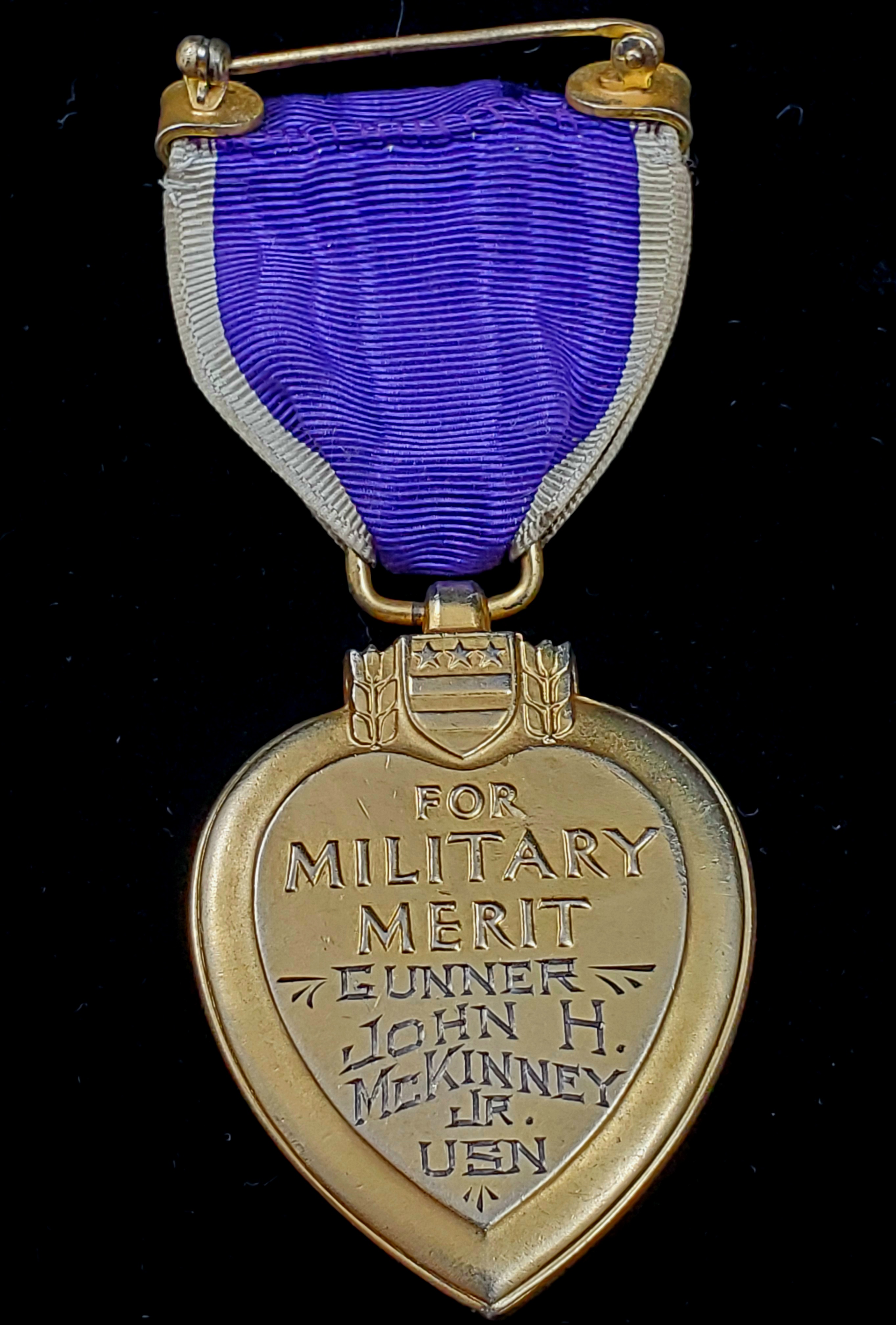 On October 13, 1942, Gunner McKinney, formerly listed as missing in action, his name was published in the Los Angeles Times among those who were killed in action. Mrs. John H. McKinney would be presented with a Purple Heart Medal bearing an engraving on the reverse of the pendant. At the end of the war, McKinney’s widow would have also received any decorations that he was due which would have included the World War II Victory Medal.