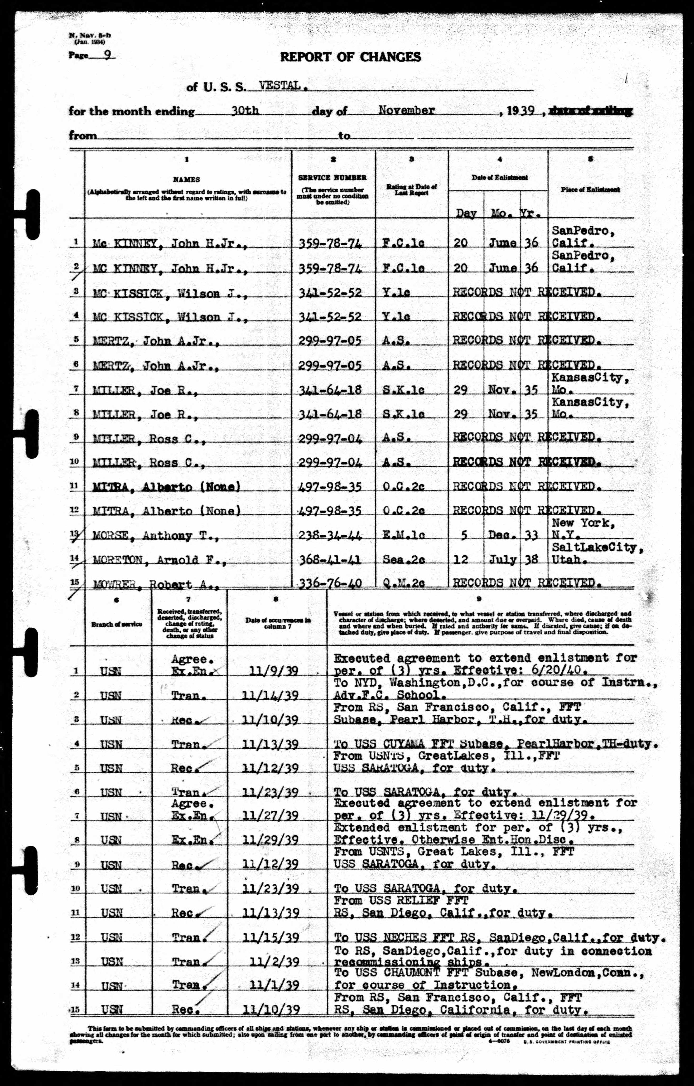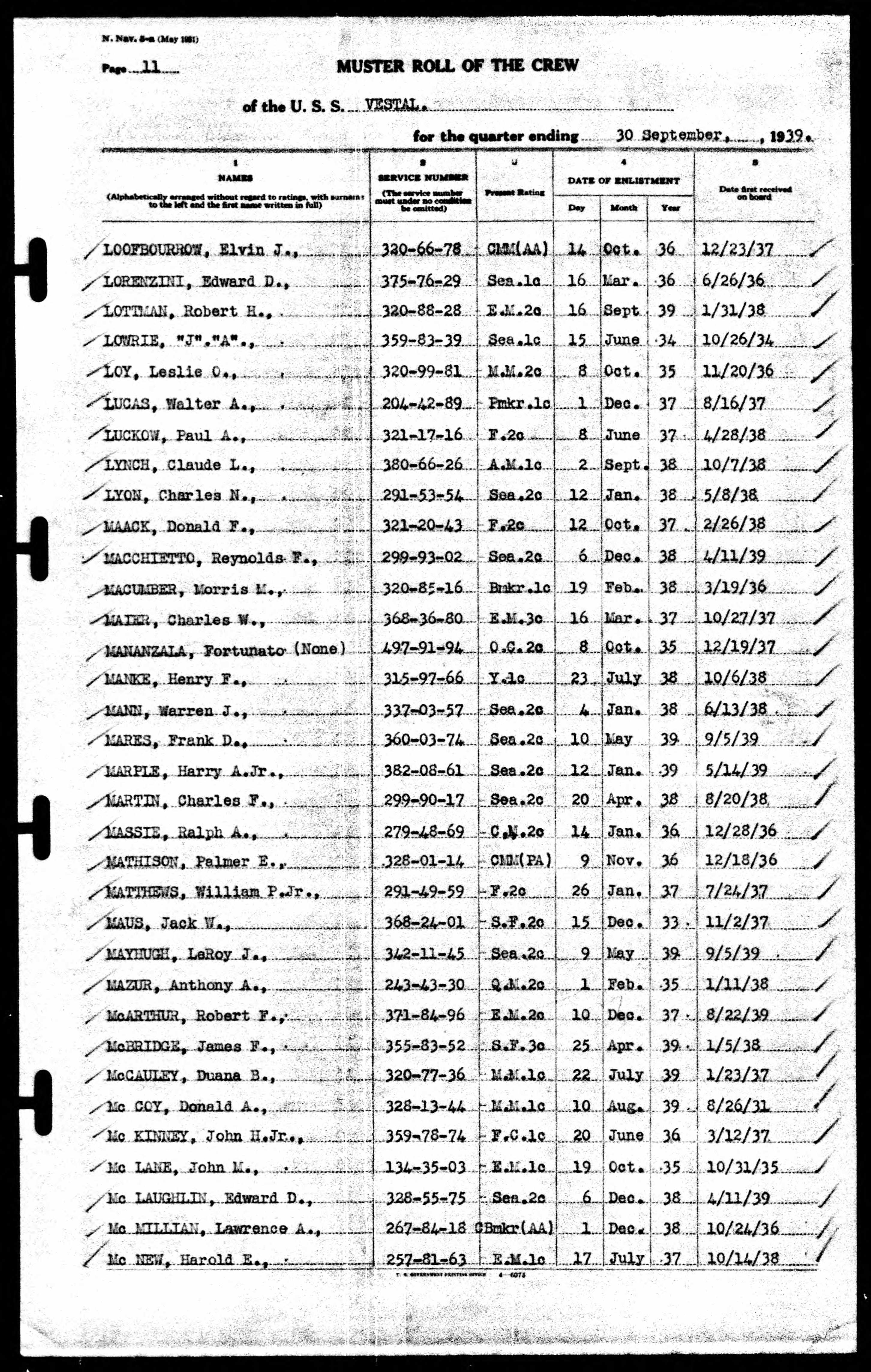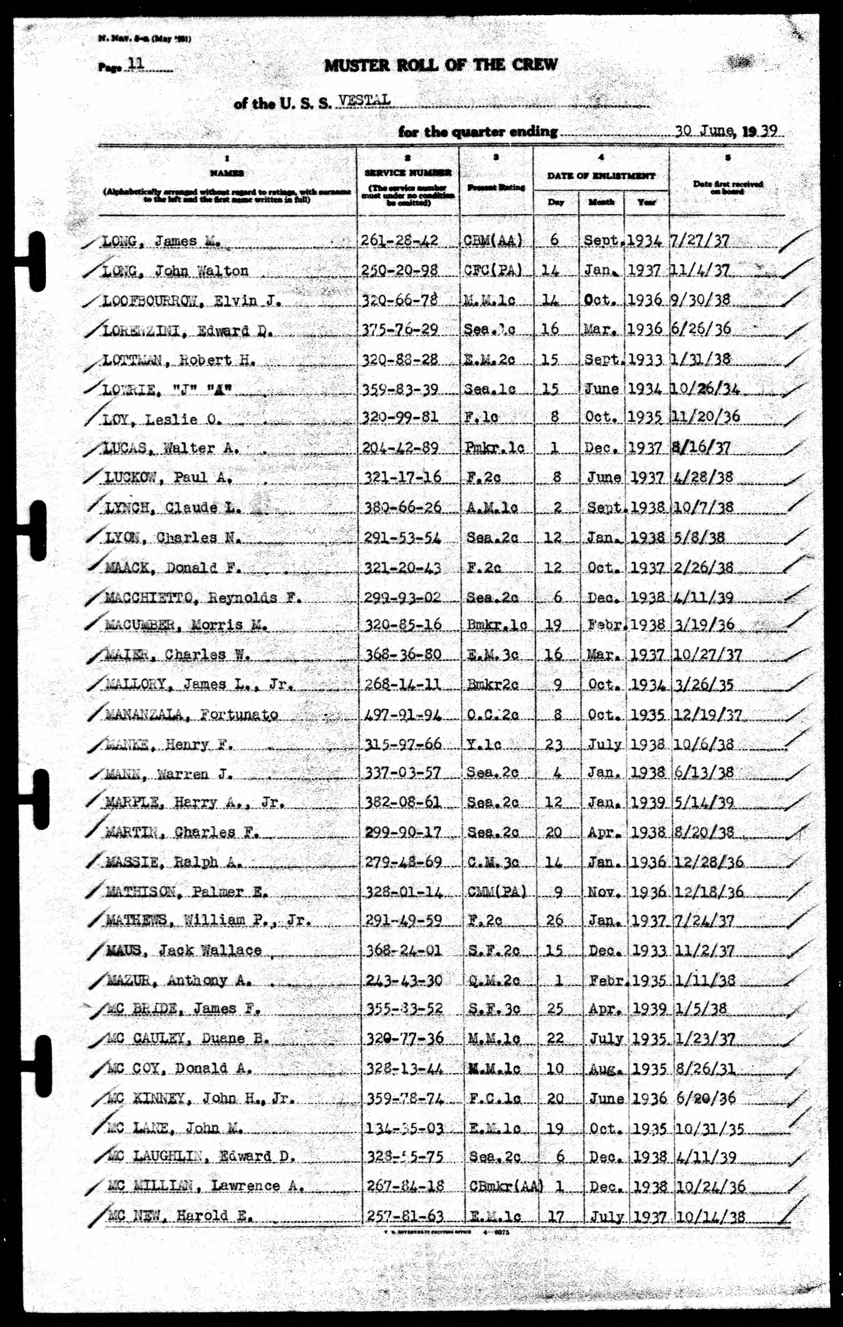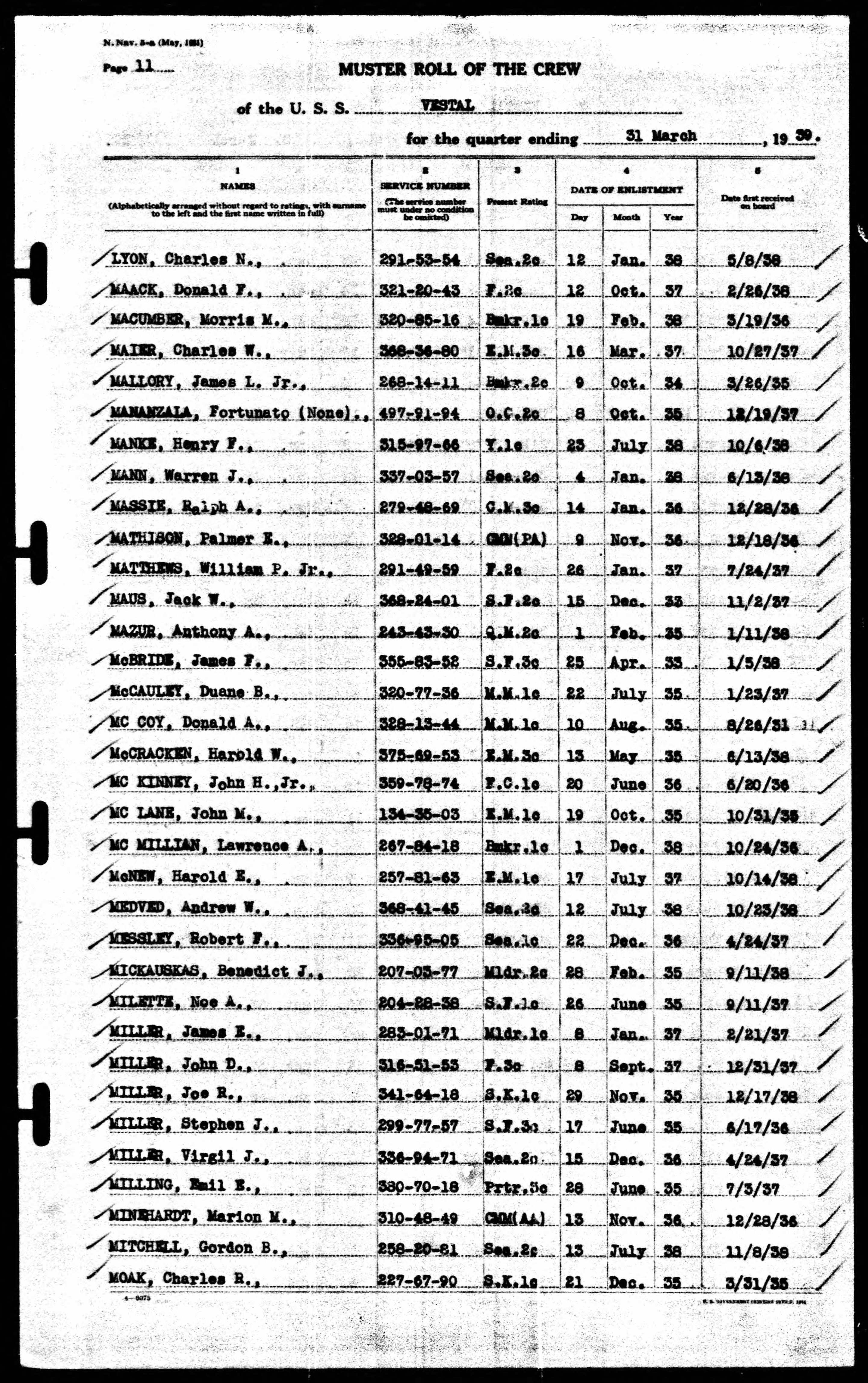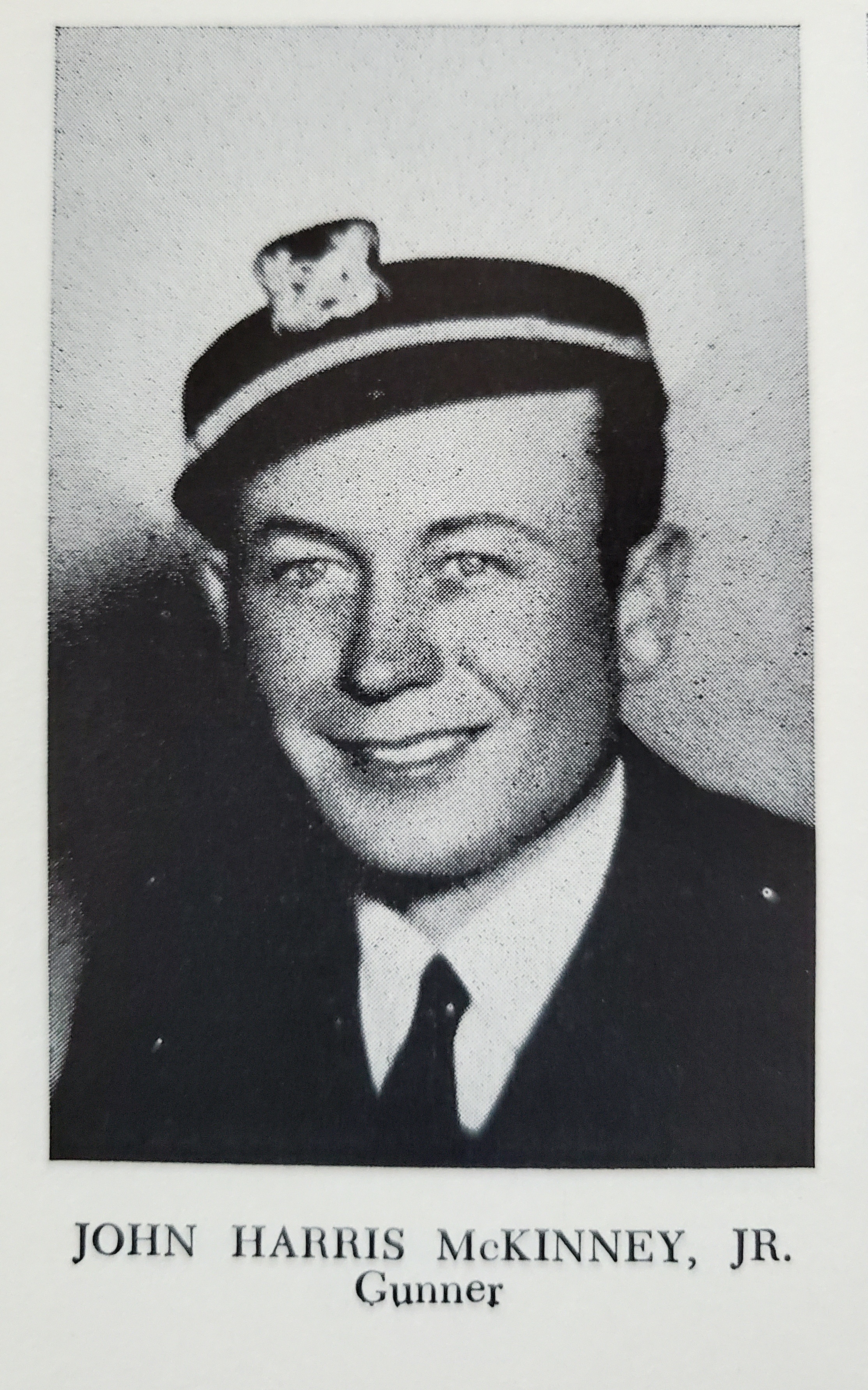 John Harris McKinney, Jr. was born on April 10, 1912 in Dalhart, Texas to John and Audie Bell. McKinney graduated from Mercedes High School in 1930 and enrolled into an Reserve Officer Training Corps program in San Antonio. John enlisted into the U.S. Navy late in 1932 and completed recruit training and Naval Training Station San Diego, California. Apprentice Seaman McKinney was assigned to the Northampton-class heavy cruiser USS Augusta (CA-31) on May 21, 1933. On January 26, 1936, McKinney was detached from the Augusta and reported aboard the repair ship, USS Vestal (AR-4) on March 12, 1937. The gap between ship assignments may have been spent on a shore command and during this time, he married the former Rubye Lee Hedrick in San Pedro, California on July 8, 1936. After completing his first term, McKinney, now rated as a fire controlman third class, reenlisted on June 20, 1936. McKinney’s career path and advancement was accelerated despite the peacetime Navy’s limited manning. John and Rubye welcomed their son, John Harris McKinney, III on December 5, 1937. Detached from Vestal on November 14, 1939, Fire Controlman first class McKinney was sent to advanced fire control school in Washington D.C., Long Island City and at Schenectady, New York. Following his completion of schools, McKinney was commissioned as a warrant officer (W-1), Gunner. With ten years of service, Gunner McKinney was halfway to retirement and a pension.