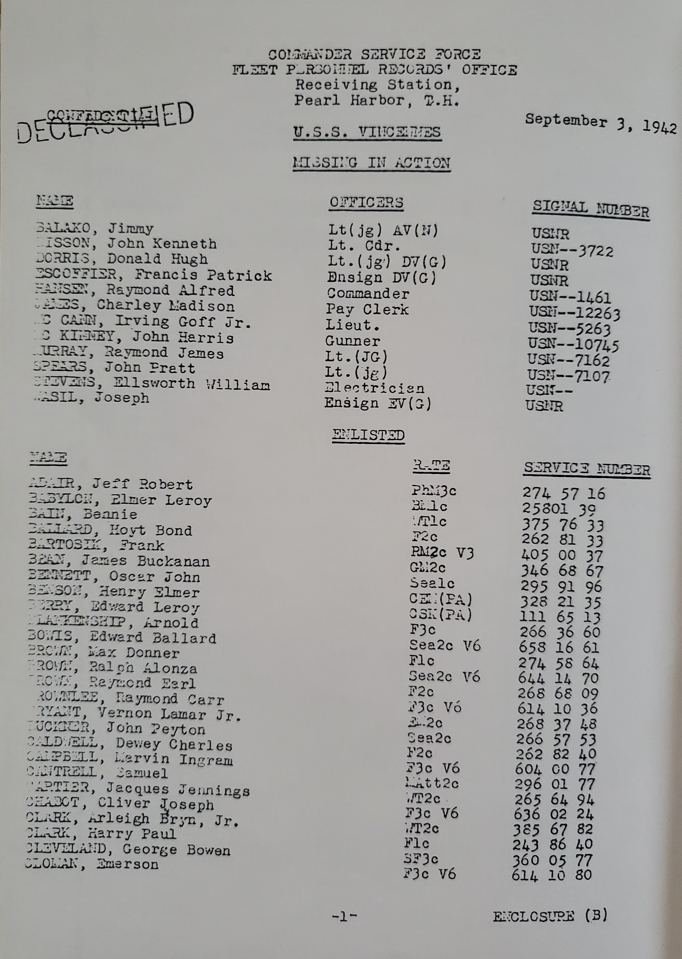 In his log of the attack, Riefkohl subsequently wrote: “The magnificent Vincennes, which we were all so proud of, and which I had the honor to command since 23 April 1941, rolled over and then sank at about 0250, 9 August 1942, about 2½ miles east of Savo Island … Solomons Group, in some 500 fathoms of water.”