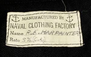 The Naval Clothing Factory tag showes that it is correct for the World War II era, has R. E. Harpainter, Seaman Second Class markings.