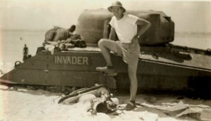 An airman poses next to a wrecked American Sherman tank on the shore of Saipan in 1944. This tank remains in place, nearly 75 years later.