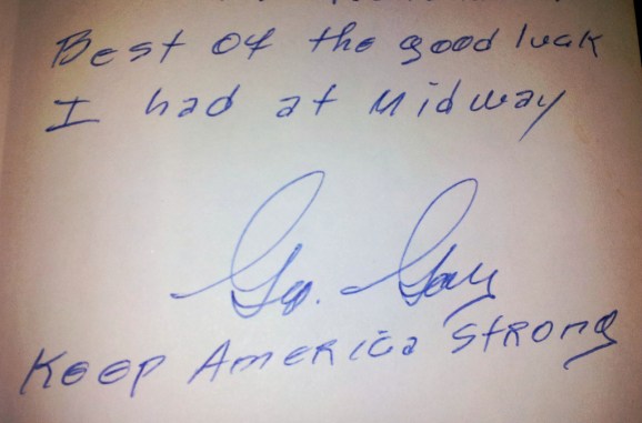 Navy Lieutenant Commander George Gay signed his autobiography in 1982. LCDR Gay was awarded his Navy Cross medal for his squadron’s torpedo dive bomber attack on the Japanese carrier, Kaga. He was the only member of his squadron to survive the attack (all were shot down, including Gay).