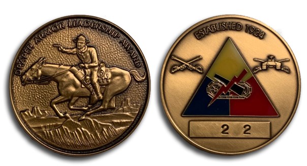 With the Goodrich Riding Trophy being presented to and residing within each recipient unit, the Draper Armor Leadership Award is presented to individuals in the form of a serialized challenge coin and a leather-bound presentation edition of the Cavalry and Armor Heritage Series book (Volume I | Leadership). Both the challenge coin and the book’s cover feature the image of the U.S. Cavalryman as it was derived from A. Phimister Proctor’s 1926 sculpture.